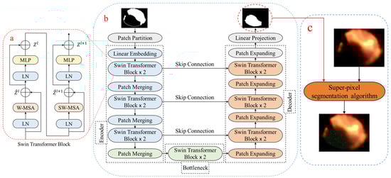 (a) Principle of Swin Transformer block. (b) Schematic diagram of pulverized coal cloud segmentation by Swi–Unet. (c) Schematic of super-pixel extraction.