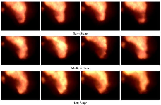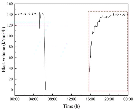The efficacy of the proposed method is next illustrated by applying it to data from a period of the BF1 of SAAB Europe with a 10 h stoppage, as seen in Figure 8 which depicts the blast volume. Specific attention will be focused on the period after the stoppage, when the target values of the blast volume and pulverized coal rate are gradually recovered, dividing the subperiod into different stages. From each stage, four tuyere images were randomly selected, illustrating, in Figure 9, the impact of the different conditions on the size and morphology of the pulverized coal cloud in the tuyere area. These images capture the dynamic characteristics of the combustion process and highlight the complex interactions between blast volume, PC injection rate, and the dispersion of coal particles. Even though a manual inspection of the images can reveal certain features it is difficult for humans to accurately determine the quality of the plume. Furthermore, the task of simultaneously observing and interpreting images from tens of tuyeres is clearly not feasible for the BF operators.