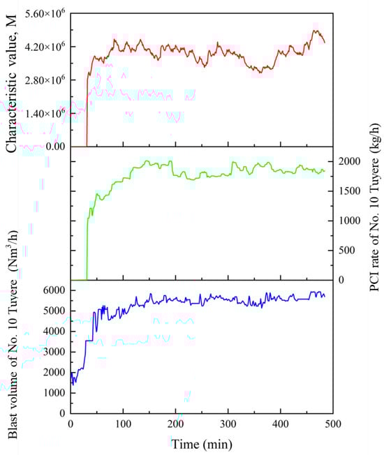 Individual blast volume (bottom panel) and PCI rate (middle panel) to tuyere #10, as well as characteristic value M during the period after the stoppage (cf. Figure 8).