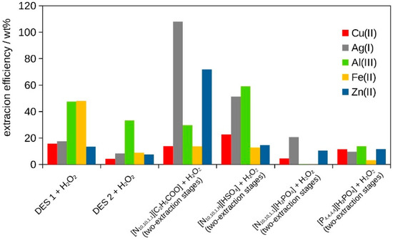The synthetized ILs with the [H2PO4]− anion revealed an extraction of silver at a level of EAg = 20.7 wt%, DAg = 0.2 with ([N10,10,1,1][H2PO4] + H2O2) after the two-extraction stage at a low temperature of T = 333 K. The second IL with this anion, [P4,4,4,4][H2PO4], exhibited a low extraction efficiency for Cu, Al, and Zn after the two-extraction stage. An average value of the extraction efficiency was observed for copper, ECu = 11.4 wt%, DCu = 0.1 (see Table 6). Thus, the long aliphatic chains at the cation of the IL ([N10,10,1,1][H2PO4]), proposed as the additional influence of the surfactant on the extraction from the solid phase, were not very attractive with this anion [63]. The extraction efficiency after the single- or two-extraction stages for DES 1, DES 2, and different ILs + H2O2 at T = 318–333 K for 2–3 h, 3000 rpm, and at different pHs is summarized in Figure 2.