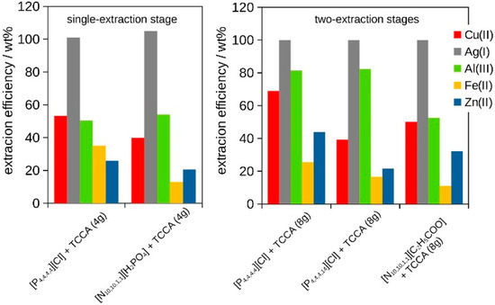 The extraction efficiency after single- or two-extraction stages for different ILs + TCCA (4 g or 8 g) at T = 318 K for 2 h at 3000 rpm, pH = 1.5–3, is presented in Figure 3.