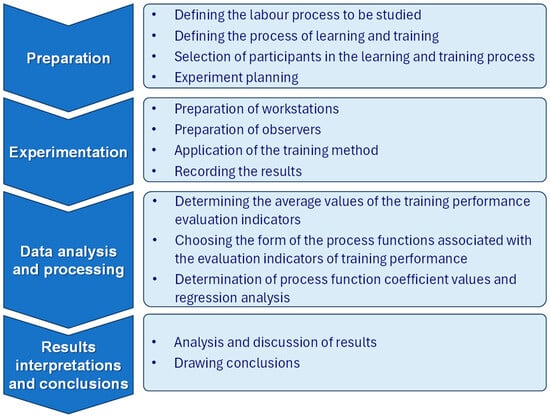 Figure 1 shows the structure of the research methodology used in this study, highlighting the main stages and their specific activities. The preparation stage (I) aims to create the necessary experimental framework for applying the training method. In the experimentation stage (II), the study participants’ training method is applied, and the experimental data are recorded. The data analysis and processing stage (III) aims to determine the process functions associated with the indicators for evaluating the training performance of the participants. Finally, in stage (IV), the results are interpreted, and conclusions are drawn based on the findings.