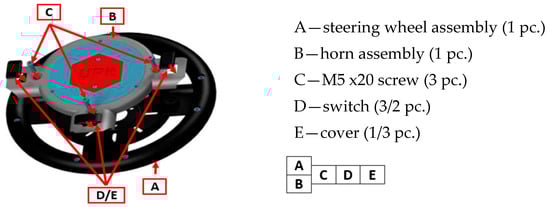 In this study, a medium-complexity operation was considered as one of the four assembly process operations, which mostly involved manual activities. This includes the following work phases, as shown in Figure 2: (a) taking the steering wheel assembly (A) from the operational transfer case and positioning it in the device; (b) taking the horn assembly (B) from the operational transfer case and positioning it on the steering wheel assembly; (c) selecting and positioning screws (C); (d) screwing screws with electric screwdriver; (e) selecting and mounting switches (D) and cover (E); (f) performing a quality check of the correctness of assembly; and (g) detaching the steering wheel product from the device and positioning it in the finished product box.