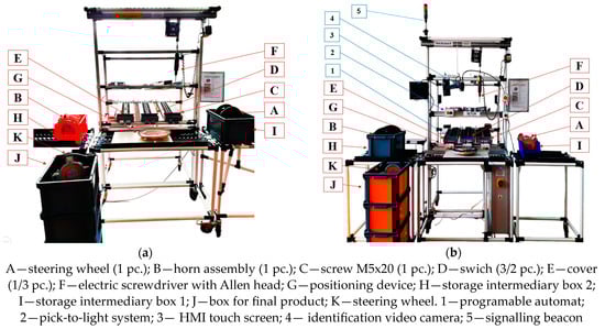This research was carried out within the lean learning factory [34] of the National University of Science and Technology POLITEHNICA Bucharest, University Center Piteşti. This lean learning factory (LLF) comprises an assembly line made of modular and flexible structures that provide flexible workstations and inter-operational transfer systems that allow for different flow systems, such as piece-by-piece or small-batch systems. At the same time, innovative equipment specific to the Industry 4.0 concept can be used in various configurations on the assembly line, such as the following: 1D scanners, pick-to-light systems, video cameras for shape and colour recognition (integrated as poka-yoke system), HMI and control panels (PLC systems), ABB robotic arms, automated indexable worktables, general automation control panels, and virtual and augmented reality equipment.