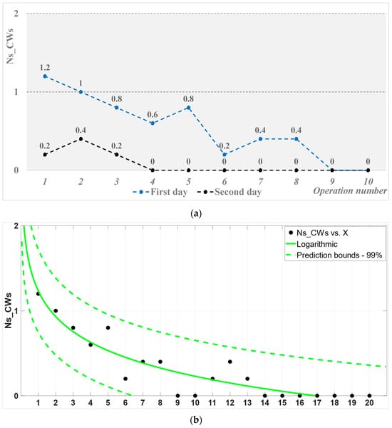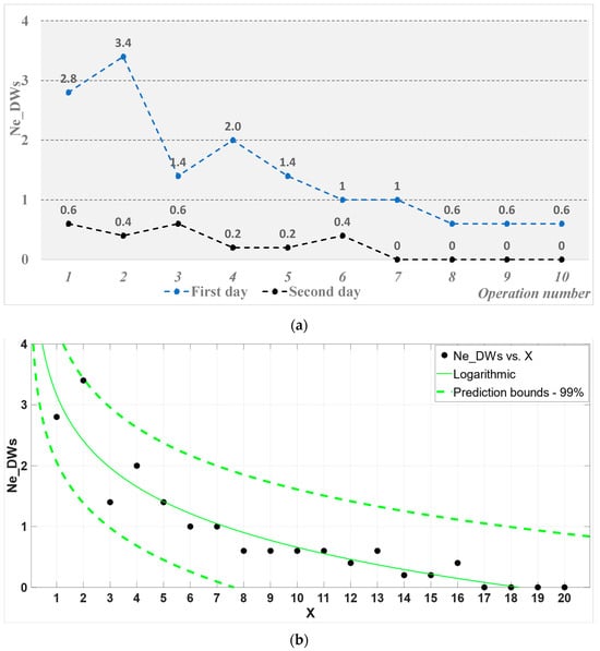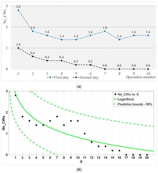 - From the point of view of the errors made—the Ne indicator, it is found that the work process was learnt by all the participants after 17 work cycles (operations) in the case of both jobs. However, some participants did not make any errors after the end of the first day of training and learned the process faster.