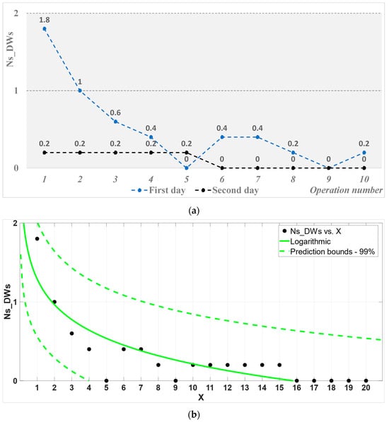 In the mathematical modelling of the evolution of the Ne and Ns indicators, the logarithmic functions used to determine the process functions associated with these indicators are adequate in the case of both workstations, and their coefficients are significant at a 99% confidence level. However, the values of the coefficient of determination, R2, of these functions are relatively small (with values from 0.7695 to 0.8879), which shows that there is not a very high level of correlation between the average values of the Ne indicators, Ns, and the number of operations (work cycles) performed by the participants. This is determined by the fact that, on the one hand, the values of these indicators are small natural numbers or zero (as a consequence of the formation process), and, on the other hand, the fact that the factors that cause errors and shutdowns are different.