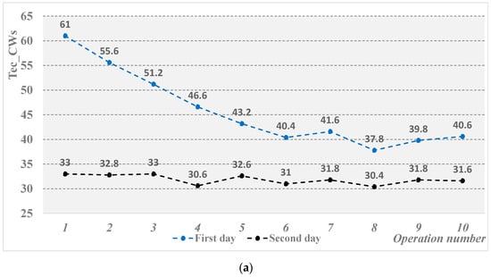 - On the second day of training, the average effective duration of the work cycle started from 40%, which was slightly higher than the level obtained at the end of the first day of training, and continued to decrease with the increase in the number of repetitions of the operation, approaching the standard value. More participants reached or fell below their normalized cycle time during the second day of the experiment;