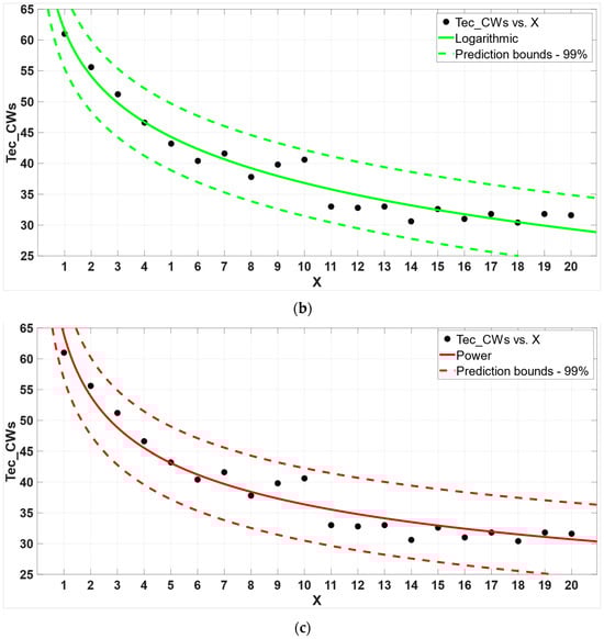 - Both mathematical models considered for the Tec_CWs process function are adequate for a confidence level of 99%, and the coefficients of these functions are significant. The coefficients of determination of the functions have high values (0.9608 for the logarithmic function and 0.9522 for the power function), which indicates the data have a high level of correlation. The logarithmic function better approximates the experimental results (having a higher coefficient of determination R2), and according to it, it is estimated that the normalized duration of the work cycle will be obtained after performing 25 operations (work cycles).