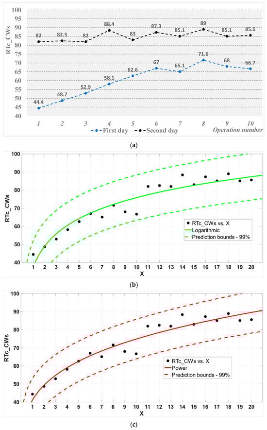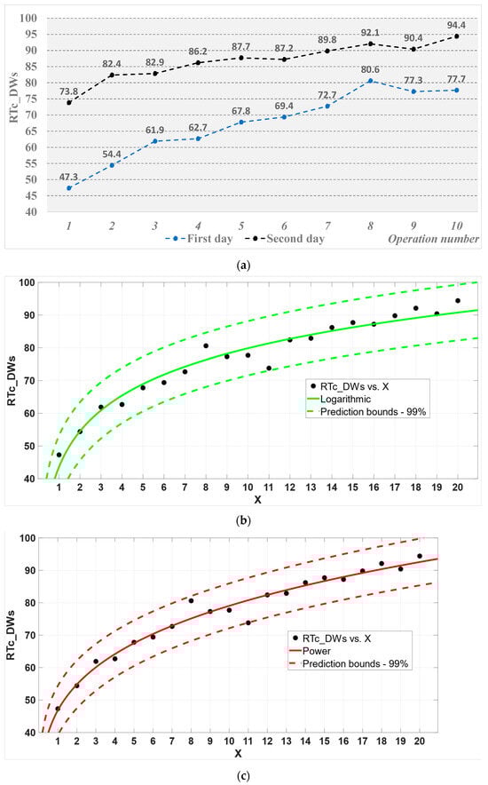 The evolution of the average degree of training of the participants in the digitalized workstation: (a) representation of experimentation days; (b) process function (logarithm) RTc; (c) process function (power) RTc.