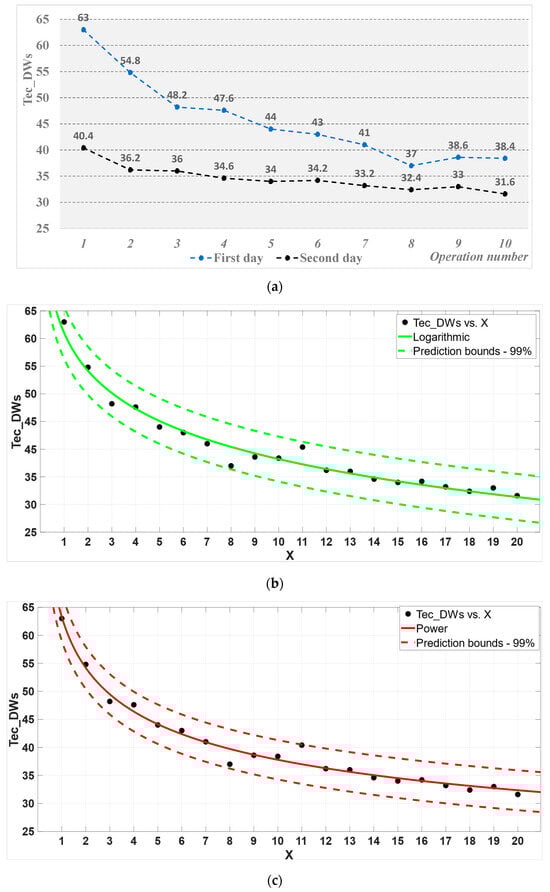 The evolution of the effective average duration of the work cycle in the digitalized workstation: (a) representation of experimentation days; (b) process function (logarithm) effective average duration of the work cycle; (c) process function (power) effective average duration of the work cycle.