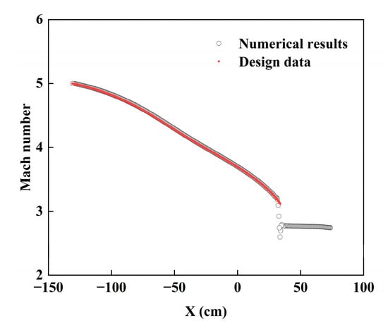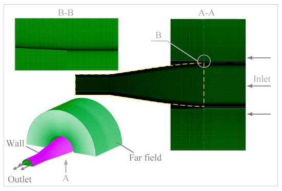 When the geometry shape was designed by the theoretical design method, numerical simulations were conducted to validate the design method. During the numerical computation, the number and distribution of grids in the inlet should be chosen to ensure the accuracy of numerical simulations. Thus, grid dependency validation and comparisons of design data and numerical results are presented in Section 3.1 and Section 3.2, respectively. Moreover, before the exergy method was applied to evaluate the corrected Busemann inlet, the inviscid flow in a Busemann inlet was analyzed by the exergy method and the results are validated with the Gouy–Stodola theorem in Section 3.3.