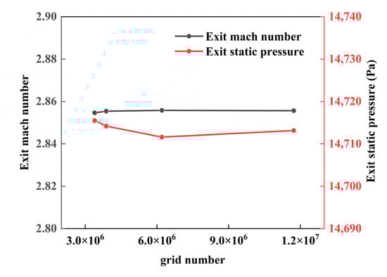 As shown in Figure 2, all parts of the computing domain were partitioned by structured hexahedral grids which were generated by the commercial software Pointwise V18.0R1. The typical normal-wall cell spacing is set to 5 microns to keep the y+ values below 1. Refinement on the edge was performed to smooth transitions around corners. The analysis of the exit Mach number and exit static pressure varies with different numbers of grids and was conducted to determine the suitable number of grids, as presented in Figure 4. It can be observed that the differences in the exit Mach number and static pressure between 3 million grids and 12 million grids are 0.016% and 0.034%, respectively. As the difference is much smaller than the errors of the numerical process, the number of grids chosen for the numerical simulations is in the middle range of about seven million.