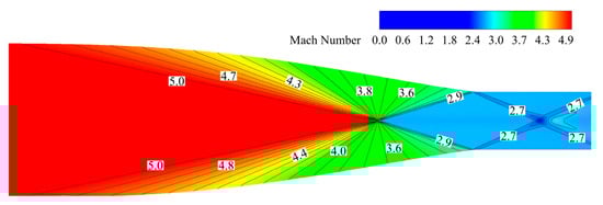 The comparison of the Mach number along the wall between the theoretical design methods and numerical results is illustrated in Figure 5. As can been seen, the numerical curve coincides well with the theoretical curve. After the last oblique shockwave, the Mach number drops rapidly below 3 and then remains at 2.74 in the numerical results, which cannot be shown in the theoretical results. It is because the Busemann inlet in the numerical analysis has an isolation section. Figure 6 shows the contour lines of the Mach number of the numerical results. The straight and clear contour lines gradually decrease from five to three, which completely conforms to the conical flow design methods.