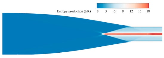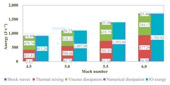 According to the Gouy–Stodola theorem, exergy destruction is equal to the entropy increase of the total system multiplied by the ambient temperature, . Thus, the rate of anergy (42.84 J∙s−1) in the designed Busemann inlet was obtained by the formula, as presented in Table 2.