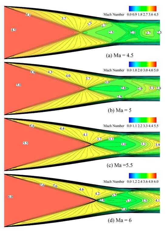 The contours of four different Mach numbers in Busemann inlets are shown in Figure 8. The thickness of the boundary layer gradually increases from the entrance of the inlet and the Mach number contours become curved relative to that of the inviscid flow. As the incoming Mach number gradually increases, the apex of the conical shock moves backwards towards the throat. It is worth noting that the base of the conical shock aligned with the shoulder when the inlet was an on-design case, while in other speed cases, the phenomena of the boundary layer interacting with the shoulder-generated shocks, the conical shock and its reflected shocks are more obvious, leading to a more complicated flow field. These trends are consistent with the results obtained in [30]. As would be expected, the intensity of impinging the shock waves and reflected shock waves increases with the Mach numbers.