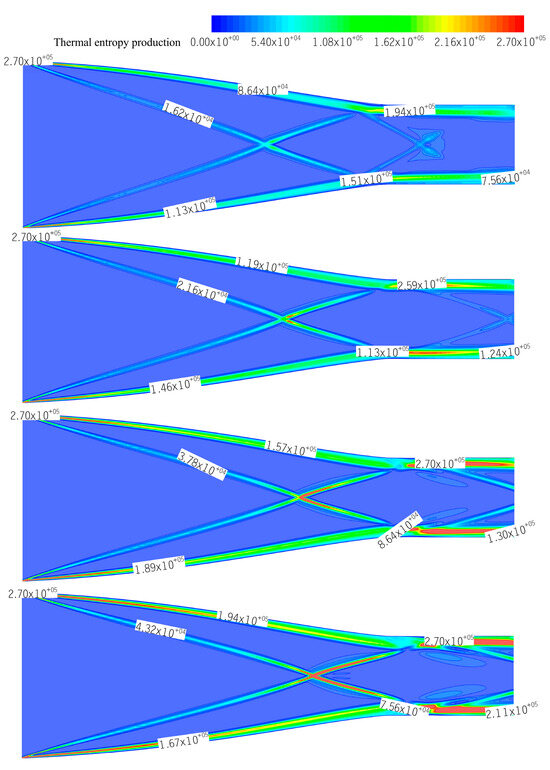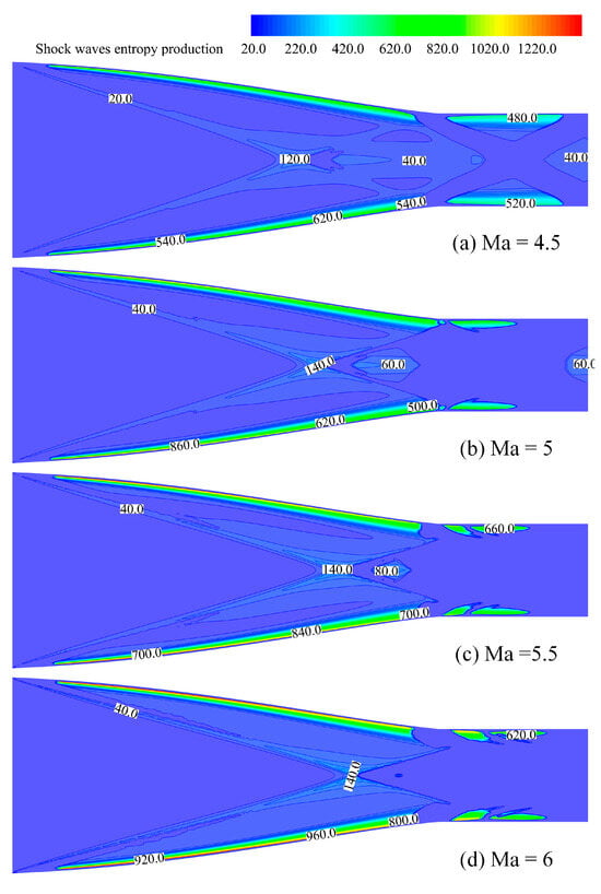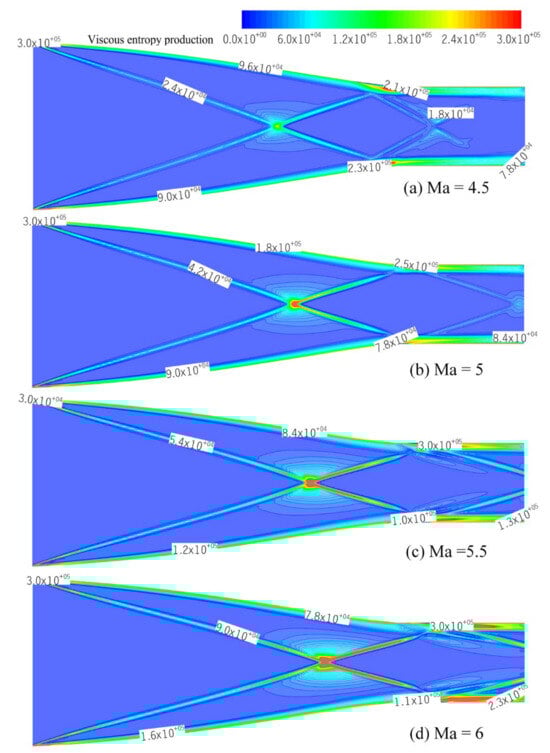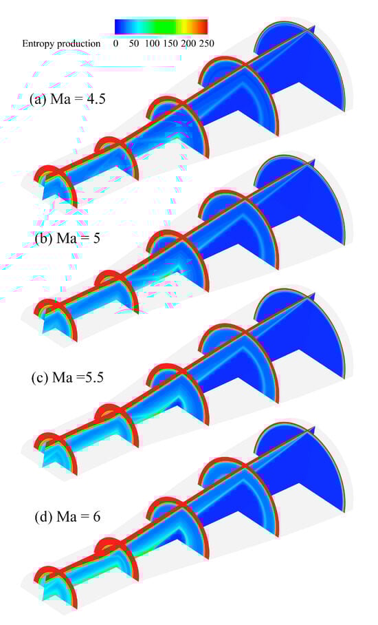Thermal entropy production in the inlet mainly occurs at the intersection of conical shock waves and the boundary layer of isolators, as observed in Figure 11. When the Mach number is lower than or equal to the design Mach number (Figure 11a,b), it is obvious that the thermal entropy production increases with the boundary layer thickness and the intensity of the shock waves and their reflected shock wave. This phenomenon is consistent with the formula that a key factor influencing thermal entropy production is the value of the temperature gradient in the airflow (Equation (9)). When the Mach number is greater than the design value (Ma = 5.5 or 6), the thermal entropy production contours become complex, as shown in Figure 11c,d. In addition to a substantial amount of entropy production generated at the intersection of the conical shock wave, the reflection of the conical shock wave at the isolator jointed with the expansion wave occurring at the shoulder caused severe turbulence pulsation, deformation and flow separation in the boundary layer, resulting in an intense heat exchange. Moreover, the main flow area could not remain spatially uniform due to sudden changes in the thickness of the boundary layer, leading to the emission of shock waves from the boundary layer towards the main flow. This shock wave follows the expansion wave and the reflected conical shock waves aforementioned that simultaneously affect the temperature gradient in the main flow and generate a considerable amount of entropy generation.