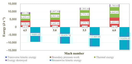 The decomposition of the exergy at the entrance and exit of the control volume according to Equations (5) and (6) is shown in Figure 14. It can be observed that the inflow exergy increases with the Mach number, as the incoming streamwise kinetic exergy shown below the coordinate axis accounts for all the inflow exergy. Afterwards, the vast majority of the inflow exergy is converted into boundary pressure work (>40%) and thermal exergy stored in the high-temperature airflow (approximately 46%). The proportion of boundary pressure work decreases from 43.6% to 41.2% as the Mach number increases from 4.5 to 6. A very small portion of the inflow exergy is converted into transverse kinetic energy which is probably due to the turbulent shear flow. All the remaining exergy is destroyed in the manners mentioned in Figure 13 with an exergy efficiency of about 90%.