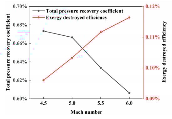 Commonly used total performance parameters and indicators related to exergy are analyzed in this section. The total pressure Recovery coefficient is usually taken to evaluate the loss of work potential in the process when the high-speed airflow passes through the inlets. As shown in Figure 15, the total pressure recovery coefficient drops from 67.3% to 60.6% as the Mach number increases, which corresponds to a rise from 9.6% to 11.6% of exergy destruction efficiency. It can be deduced from the values that some of the lost energy calculated in the total pressure recovery coefficient way still belongs to the available energy. This is mainly because thermal exergy in the high-temperature airflow at the outlet is treated as a loss in the calculation process of the total pressure recovery coefficient, while in fact, this part of thermal exergy enters the combustion chamber and will further convert into useful work.