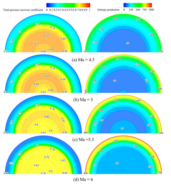 The total pressure recovery coefficient (left) near the wall is very low, almost close to 0. Correspondingly, a large amount of entropy production (right) is generated at the same place, as seen in Figure 16. Moreover, the total pressure recovery coefficient gradually rises and then falls along the radial direction towards the center parts, and the entropy production drops and then rises with the same pace. This indicates that the airflow with a maximum total pressure recovery coefficient and maximum exergy efficiency are not located at the center, but approximately in the middle area along the radial direction. The airflow near the axis loses exergy as the airflows are unequal in their direction and magnitude of radial velocity, as mentioned in Section 3.2, while the airflow near the wall loses exergy by the interaction between the shock wave and boundary layer, as mentioned in Section 4.1, thus resulting in the high performance of airflows in the middle area. In addition, the entropy production of the entire cross-section of the outlets increases as the Mach number rises, which leads to an ascension of the total exergy destruction efficiency, as shown Figure 15. As a whole, the Busemann inlet with a circular cross-section and no off-center has a very uniform airflow at the outlet along the circumference.