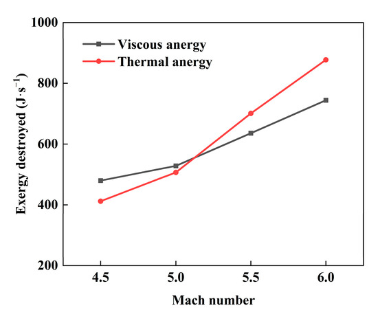 Thermal anergy and viscous anergy are the main losses of exergy in inlets. Figure 17 shows that thermal anergy rises from 411.8 J∙s−1 to 877.28 J∙s−1 and viscous rises from 479.7 J∙s−1 to 744.17 J∙s−1 as the Mach number increases from 4.5 to 6. An intersection point was observed between these two curves when the Mach number was between 5 and 5.5. The thermal anergy is lower than the viscous anergy when the Mach number is below the intersection point. However, after the intersection point, the thermal anergy rapidly increases and is higher than the viscous anergy. It is probable that the convective heat transfer coefficient increases significantly and heat mixing in the inlet becomes more intense when the Mach number is above the design point, whereas the viscosity coefficient varies less with the airflow speed and temperature. As the shock is almost negligible, it implies that the optimization of the minimum total exergy destroyed can be made to find the particular Mach number when the sum of thermal anergy and viscous anergy is minimum.