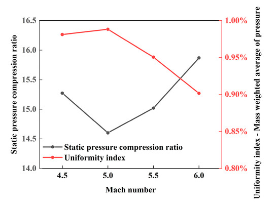 The curves of the static pressure compression ratio and uniformity index are displayed in Figure 18. A higher static pressure compression ratio represents higher pressure at the exit, which helps to prevent the back pressure from the combustion chamber that may cause the inlet unstart. The air flow at the design point has the best uniformity index (98.8%), but with the lowest static pressure compression ratio (14.6). The increased outlet static pressure comes at the price of the nonuniformity of the flow field.