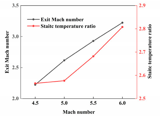 The exit Mach number rises from 2.23 to 3.22 and the static temperature ratio rises from 2.56 to 2.80 as the flight Mach number increases, as shown in Figure 19. A higher static temperature ratio usually means a higher thermodynamic efficiency if it does not exceed the maximum allowable compression temperature (1440 K–1670 K) which may cause unequilibrated dissociation and loss of exergy. However, the increased exit Mach number implies a shorter time for the airflow to stay in the combustion chamber, which may lead to a decrease in the combustion efficiency. Thus, is it necessary to determine a reasonable flight Mach number to ensure an optimal tradeoff combination of various performance parameters.