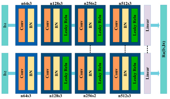 The coupled relative discriminator consists primarily of five convolutional layers, three LeakyReLU activation layers, three batch normalization layers, and a LINEAR layer. The input data is an image with dimensions of 256 × 256 × 3, and each convolutional layer utilizes a 5 × 5 filter. An activation function of LeakyReLU is added following each convolutional layer to mitigate the gradient disappearance issue. The number of convolution kernels is 64, 128, 256, and 512 for the four convolutions, respectively. The final layer is a linear layer that transforms the flattened image features into an output value representing the similarity between the synthetic and real images. To decrease the quantity of required training data, the last two convolutional and linear layers share weight parameters. The structure of the coupled relativistic discriminator is presented in Figure 3.