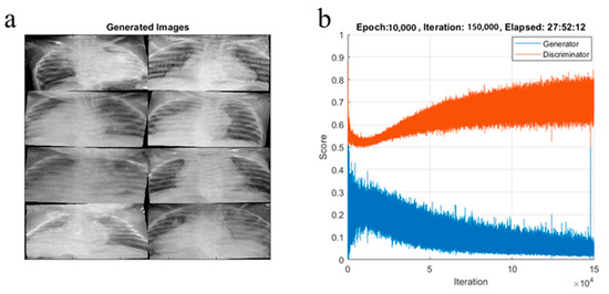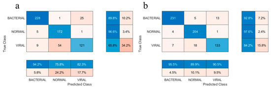 To assess the efficacy of RCGAN-CTL on multi-classification networks, VGG19 was trained using the RCGAN-CTL approach and, without it, employing the original dataset, as depicted in Figure 8. The confusion matrix was generated using the validation set, indicating a significant improvement in the model’s accuracy after implementing RCGAN-CTL. The existence of similar overlapping features between viral pneumonia and bacterial pneumonia [23] can result in the misidentification of images when VGG is trained directly with the original data, as shown in Figure 8a, where a considerable portion of viral pneumonia classification produces errors. However, the implementation of the RCGAN-CTL method has led to better performance. A comparison between Figure 8a,b shows that the accuracy has improved from 88.1% to 96.1%, and the precision of normal lungs, bacterial pneumonia, and viral pneumonia has increased from 75.8%, 94.2%, and 82.3% to 89.9%, 95.5%, and 90.5%, respectively. Additionally, the sensitivity has risen from 96.6%, 89.8%, and 65.8% to 97.6%, 92.8%, and 84.2%, resulting in improved F1-score values from 84.9%, 91.9%, and 73.2% to 93.6%, 94.1%, and 87.2%. The findings reveal that utilizing the RCGAN-CTL method can enhance the model’s ability to achieve accuracy, classification effectiveness, and stability in multiclassification tasks.