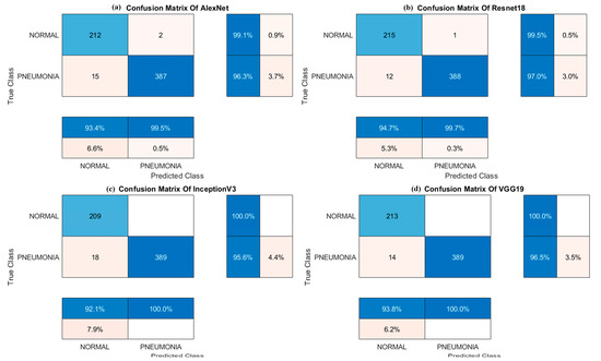 Confusion matrix of the base Alexnet (a), Resnet18 (b), InceptionV3 (c), and VGG19 (d) transfer learning models.