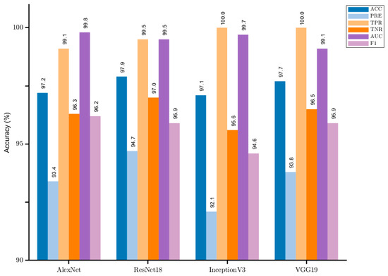 Multifactor histograms of the four networks for the evaluation parameters of accuracy (ACC), precision (PRE), sensitivity (TPR), specificity (TNR), the area under the ROC curve (AUC), and F1-score (F1).
