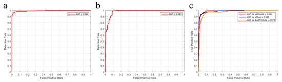 The ROC curves presented in Figure 9 depict the performance of the VGG19 models when utilizing the RCGAN-CTL method for both the dichotomous and trichotomous tasks. In Figure 9, the ROC curves for the VGG19 models using the RCGAN-CTL method are shown. Panel (a) indicates an AUC of 99.4%, demonstrating the model’s precision in differentiating between ‘normal’ from ‘pneumonia’ in chest radiographs. Panel (b) reveals an AUC of 98.1% for distinguishing between ‘viral’ and ‘bacterial’ pneumonia, critical for treatment planning. Panel (c) presents AUC values of 99.0% for ‘normal’, 98.9% for ‘viral’, and 97.3% for ‘bacterial’ pneumonia, showcasing the model’s capability to accurately classify these three distinct conditions. The high AUC values indicate that the models are capable of effectively distinguishing between normal and abnormal cases as well as accurately identifying the specific type of pneumonia present.