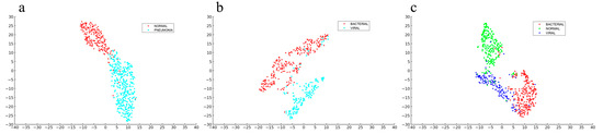 t-SNE plot comparison of VGG19 based on RCGAN-CTL. ((a) normal/pneumonia; (b) viral pneumonia/bacterial pneumonia; (c) normal/viral pneumonia/bacterial pneumonia).