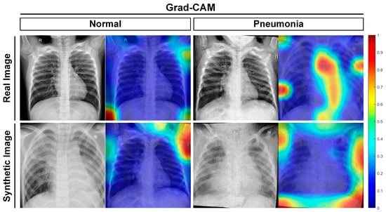 The utilization of the gradient-based class activation mapping technique involves the processing of real and synthetic images of normal lungs and pneumonia, respectively. As displayed in Figure 11, the Grad-CAM processed images are presented, with the top and bottom columns representing the real and synthetic images of normal and pneumonia, respectively. The findings indicate that the synthetic images exhibit similar feature localization to the real images, with pneumonia demonstrating a patchy solid localized area with bilateral multifocal ground glass-like shadows, sometimes accompanied by patchy solid lesions, with the thermogram surrounding or directly overlaying the lesioned area. Notably, none of the normal lung images exhibit significant thermogram overlay, indicating that the synthetic images are of sufficiently high quality for dataset expansion and that the RCGAN-CTL approach is reliable and valid.