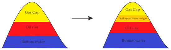 During its development, the pressure of formation decreases, and the original equilibrium state of the reservoir is destroyed. The distribution of phase changes before and after development is shown in Figure 1: When the pressure is greater than the bubble-point pressure, there is no liquid in the gas cap, the bottom water advances, the water vapour of the water phase enters more into the gas cap, the bottom water intrudes into the oil zone, and the main driving energy of gas reservoir is gas-elastic performance [15,16]. When the formation pressure is less than the bubble-point pressure, the subsurface fluid produces phase changes, and the dissolved gas in the crude oil precipitates, the water vapour in the aqueous phase further escapes, the sideprime water further intrudes, and the elastic expansion of the rock and bound water occurs, and so on, in a series of phase transformations and energy exchanges [15,27,28,29,30,31].