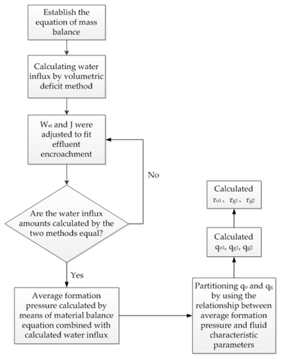 The material balance equation and Formulas (7)–(9) for a gas-cap reservoir with water influx are derived by modifying Li Chuanliang’s comprehensive drive-reservoir material-balance relationship. This relationship calculates the entire reservoir as a whole and often does not consider the direction of fluid flow, making it a zero-dimensional model of reservoir fluid flow [32]. Newton’s iterative method is quoted from numerical analysis books [34].