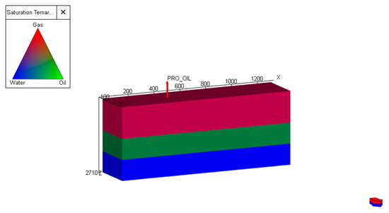 Based on the actual production data of a mining plate in the CQ oilfield, using digital analog software tNavigator, a component model is used to simulate a bottom-water water-driven gas-cap reservoir production well, considering the expansion of bound water, rocks, and gas cap. The model is 325 m × 1300 m × 28 m, the crude-oil geological reserve is 2.33 × 105 m3, the gas reserve is 7.62 × 107 m3, the initial formation pressure is 19.7 MPa, the formation temperature is 389.3 K, the water-phase volume coefficient is 1, the crude-oil volume coefficient is 1.5, and the ratio of gas-cap volume-to-reservoir volume is 0.7. The original porosity is 0.2, the original gas saturation of the gas cap zone is 70%, and the radial permeability is 220 mD. The pressure of this gas-cap reservoir will be gradually reduced in the process of extraction, and the set extraction time is 6.78 years. According to the actual production data of the oilfield, the mechanism model of the gas-cap reservoir with bottom water is constructed, as shown in Figure 3, to simulate the whole development process.