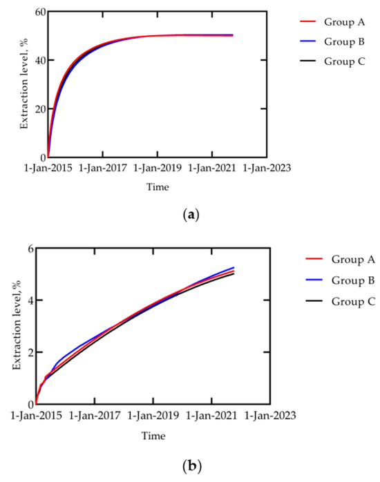 The accuracy of the proposed method is verified by comparing it with the results of the phase-recovery degree calculated by tNavigator numerical simulation software, which is used as a calculation control group for comparative judgment. The phase-recovery degree calculated by numerical modeling software, comparison method introduced and the phase-recovery degree calculated based on the average formation-pressure method, is displayed below. Group A represents the results of the phase-recovery degree calculated by numerical modeling software, Group B represents the degree of split-phase extraction calculated based on the average formation pressure approach, and Group C represents the further calculation of the phase-separation extraction degree based on the introduced method and the data provided in the article. The comparison curves are shown in Figure 6.