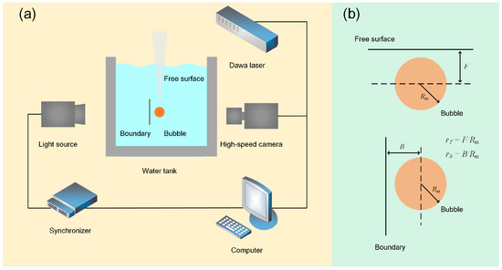 The schematic description for the experimental setup: (a) the whole system, and (b) the detailed information about the relative position between the bubble and boundary in space.