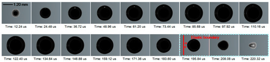 Cavitation bubble dynamics near the elastic boundary. Time: 0–110.16 μs, the expanding cavitation bubble. Time: 122.40–220.32 μs, the contracting cavitation bubble, and apparent non-spherical deformation, rb = 1.15, Rm = 1.20 mm.
