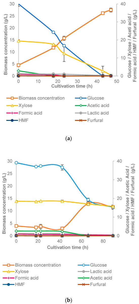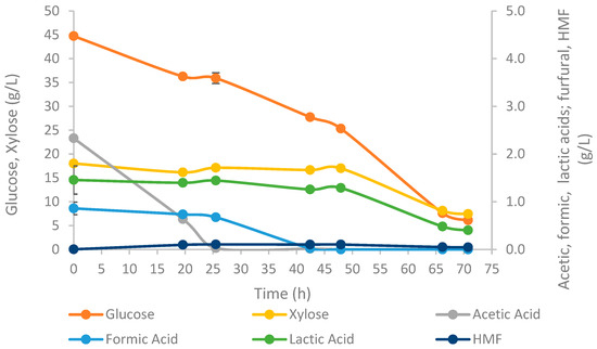 The initial acetic acid concentration was 2.33 g/L and was completely consumed at t = 25.5 h. The initial lactic acid concentration was 1.46 g/L, reaching 0.40 g/L at the end of the cultivation. The HMF concentration was always below 0.10 g/L.