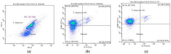 It can be seen that the yeast elliptical distribution stood out from the background composed of particles and dust (Figure 2a). A gate (P3) was drawn around this distribution. The same sample was further stained with an SYBR/PI mixture and the stained cells were detected with the fluorescent detectors FITC-A and PC5.5-A. The respective SYBR/PI plot is shown in Figure 2b. The events which are stained with SYBR are located above the horizontal line and are yeast cells, since the SYBR dye penetrates all cells, further intercalating their DNA chains, boosting the cells’ fluorescence. The events which are located below the horizontal line are medium particles since they were not stained with SYBR. To further demonstrate that the elliptical population shown in FSC/SSC (Figure 2a) is T. oleaginosus cells, the P3 gate was selected and applied to the SYBR/PI plot (Figure 2c). Indeed, most of the events were placed above the horizontal line, as they were stained with SYBR, confirming that these events are yeast cells. Therefore, T. oleaginosus cell counting was performed after SYBR/PI staining to ensure that only cells were considered, without the particles’ interference.