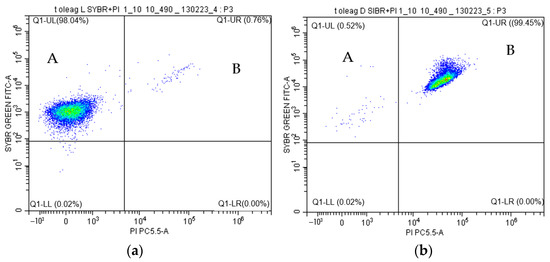 A major subpopulation (98.84%) composed of cells stained with SYBR but not with PI (SYBR+PI−) is depicted in Figure 3a, corresponding to exponentially growing yeast cells with intact membranes, since they were not stained with PI. As expected, the heat-treated cells (98.8%) appear in the upper right quadrant, being double-stained with SYBR+/PI+.