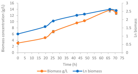 Additionally, the biomass concentration’s gravimetric quantification was performed by weighting the cell pellet containing 1 mL of culture broth, which was centrifuged at 9000 rpm for 5 min (Heraeus Sepatech Biofuge 15, DE, Hanau, Germany), with the remaining pellet then washed and resuspended in 1 mL of deionized water. After a second centrifugation under the same conditions, the final pellet was oven-dried at 100 °C overnight.