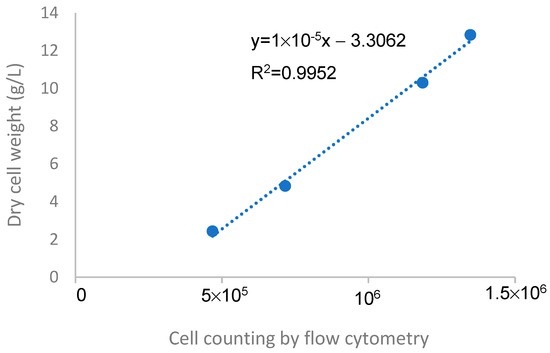 Flow cytometry was used to count T. oleaginosus cells during the bioreactor cultivation. A linear correlation (R2 = 0.995) was observed between T. oleaginosus cell count determined by FC and dry cell weight (DCW) throughout the fermentation time course (Figure 5).