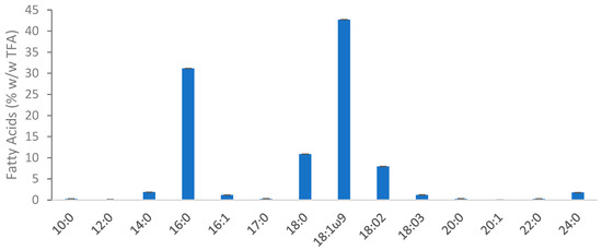 The T. oleaginosus lipid composition is depicted in Figure 7. The dominant fatty acids were oleic acid (18:1ω9), comprising 42.72% (w/w of total fatty acids, TFA), and palmitic acid (16:1ω9), comprising 31.14% (w/w TFA). Stearic (18:0) and linoleic acids (18:2ω6) were present at 10.87% (w/w TFA) and 7.93% (w/w TFA), respectively. Other fatty acids were present at percentages lower than 5% (w/w). In terms of lipid classes, the saturated, monounsaturated, and polyunsaturated fatty acids comprised 46.89%, 43.97%, and 9.14% (w/w TFA), respectively. A similar FA profile was reported when T. oleaginosus DSM 70022 was grown on lignocellulosic hydrolysates [14], and it was similar to those of vegetable oils [20].