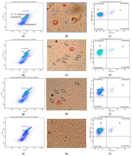 (a,d,g,j): FSC/SSC density plots concerning T. oleaginosus cells grown on CSH in the 7 L bench bioreactor, collected at t = 0 h, 22.37 h, 46.75 h, and 70.75 h; Population A displays higher FSC signals, and Subpopulation A′ displays lower FSC signals. (b,e,h,k) T. oleaginosus optical microscope photos taken at t = 0 h, 22.37 h, 46.75 h, and 70.75 h; magnification 1000×; red circles: medium particles; blue circles: T. oleaginosus single cells; black circles: T. oleaginosus budding cells. (c,f,i,l) SYBR/PY density plots concerning T. oleaginosus cells grown on CSH, in the bench bioreactor, collected at t = 0 h, 22.37 h, 46.75 h, and 70.75 h. Subpopulation B (SIBR+; PI−) was composed of T. oleaginosus cells with intact membranes; Subpopulation C (SIBR+; PI+) was composed of T. oleaginosus cells with damaged membranes; Subpopulation B′ (SIBR+; PI−) was composed of T. oleaginosus cells with intact membranes, but which were smaller than cells from Subpopulation B.