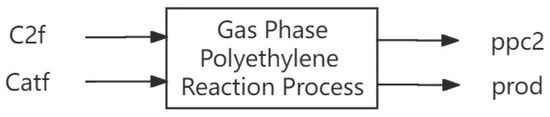 In this section, four typical variables are selected for model identification. Among these, ethylene flow rate (C2f (kg/h)) and catalyst feed amount (Catf (kg/h)) are chosen as inputs, and ethylene partial pressure (ppc2 (ppm)) and polyethylene production (prod (kg/h)) are selected as outputs. Their relationships are shown in Figure 2.