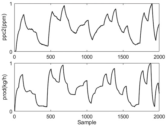 Here, 2000 sets of real sample data collected from a full-density polyethylene plant of a chemical company in 33.3 h (sampling frequency is 60 s) were selected for the simulation. In order to illustrate the effectiveness and generalization ability of the proposed on-line algorithm preferably, a little more data are required for validation, and the ratio of 3:2 was chosen for splitting the 2000 sample data. On the basis of this ratio, the first 1200 samples of the dataset were classified as the identification set, and the remaining 800 samples were chosen as the validation set in the model identification. Since the difference of scale between data is too large, the normalization preprocessing method is utilized, which takes the following form.