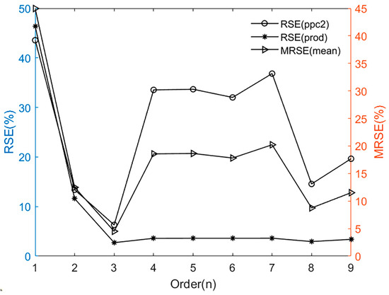 Here, the theoretical range of the optimal model order is chosen between [1,9] in this section. The circle scatters indicate the distribution of relative squared error (RSE) for ppc2 at each order, and the asterisk scatters indicate the distribution of RSE for prod. The right triangular scatters indicate the average of the two outputs, i.e., the mean relative squared error (MRSE). It can be easily seen that the model possesses the minimum value of MRSE at . Here, the MRSE values for some higher orders may be also acceptable; however, modeling the polymerization with a lower order can reduce the relevant complexity for the subsequent controller design, and thus the optimal model order is selected as 3 here.