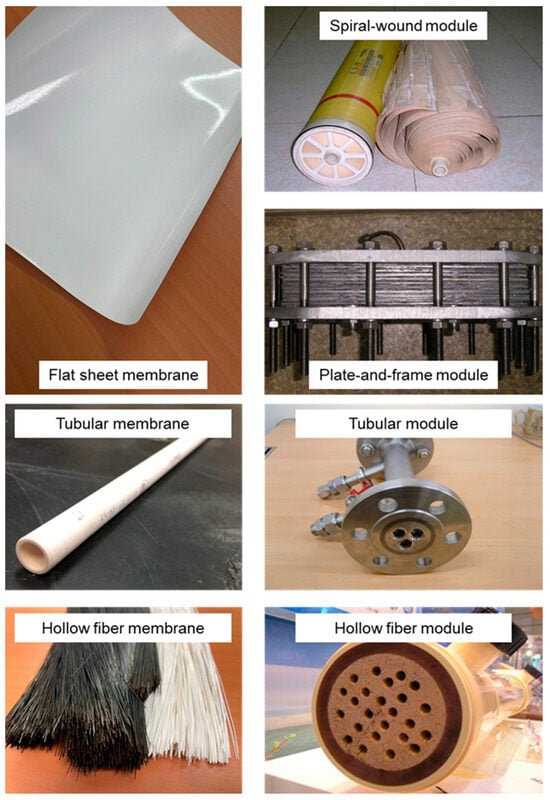 There are primarily three configurations for OSN membranes: flat-sheet (FS), hollow fiber (HF), and tubular configurations, as shown in Figure 1 [12]. FS configuration is the simplest form of an OSN membrane, often used in lab-scale experiments and small-scale applications [13]. The popularity of FS OSN membranes in academia can be attributed to being simpler to fabricate, handle, and characterize in lab settings compared to the other configurations. Flat sheets of membrane material can be stacked/layered in a plate-and-frame module or wound around a central tube, resembling a spiral-wound (SW) module, to maximize the filtration area. On the other hand, a hollow fiber (HF) configuration consists of thin, hollow strands of membrane material with an internal diameter typically less than 1 mm [14]. A similar configuration is a tubular configuration, which is larger in diameter compared to the HF configuration (i.e., internal diameter > 1 mm) [15]. They are often used in microfiltration (MF) and ultrafiltration (UF) applications, but have also been used recently to develop ceramic membranes with MoS2 selective layers [16] and polymeric selective layers [17] for OSN applications. While FS OSN membranes are more reported in the literature, there has been recently a substantial research interest in HF OSN membranes due to their self-supporting structure and high surface area-to-volume ratio, enabling dense packaging in a single module and allowing ease of scalability and separation efficiency in processing large volumes of solvent [18,19].